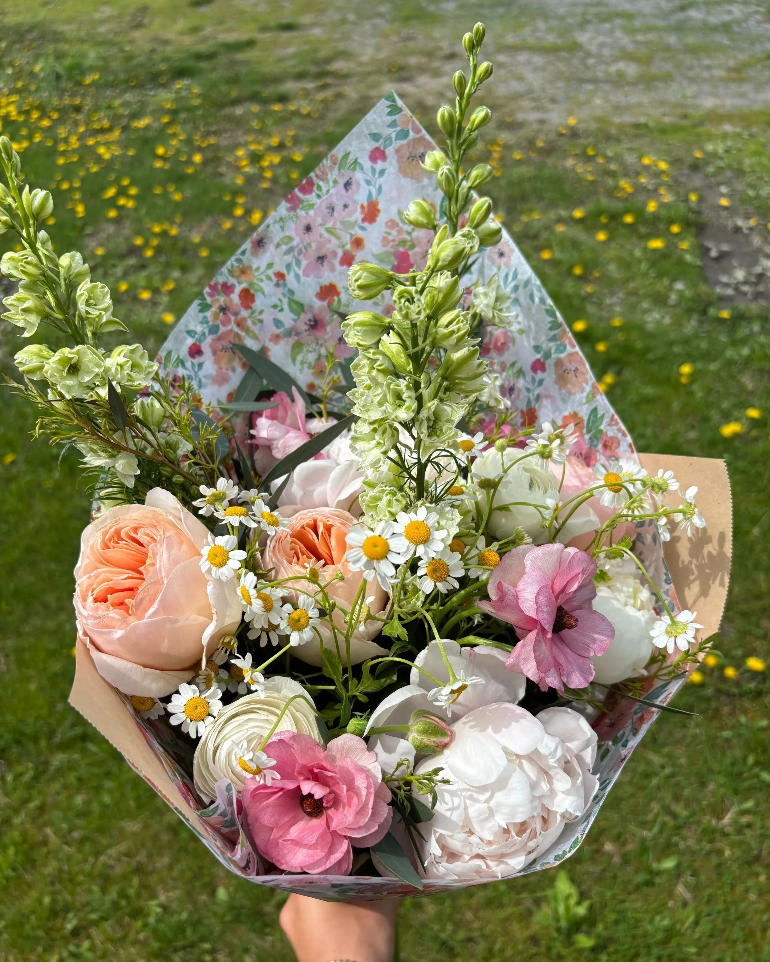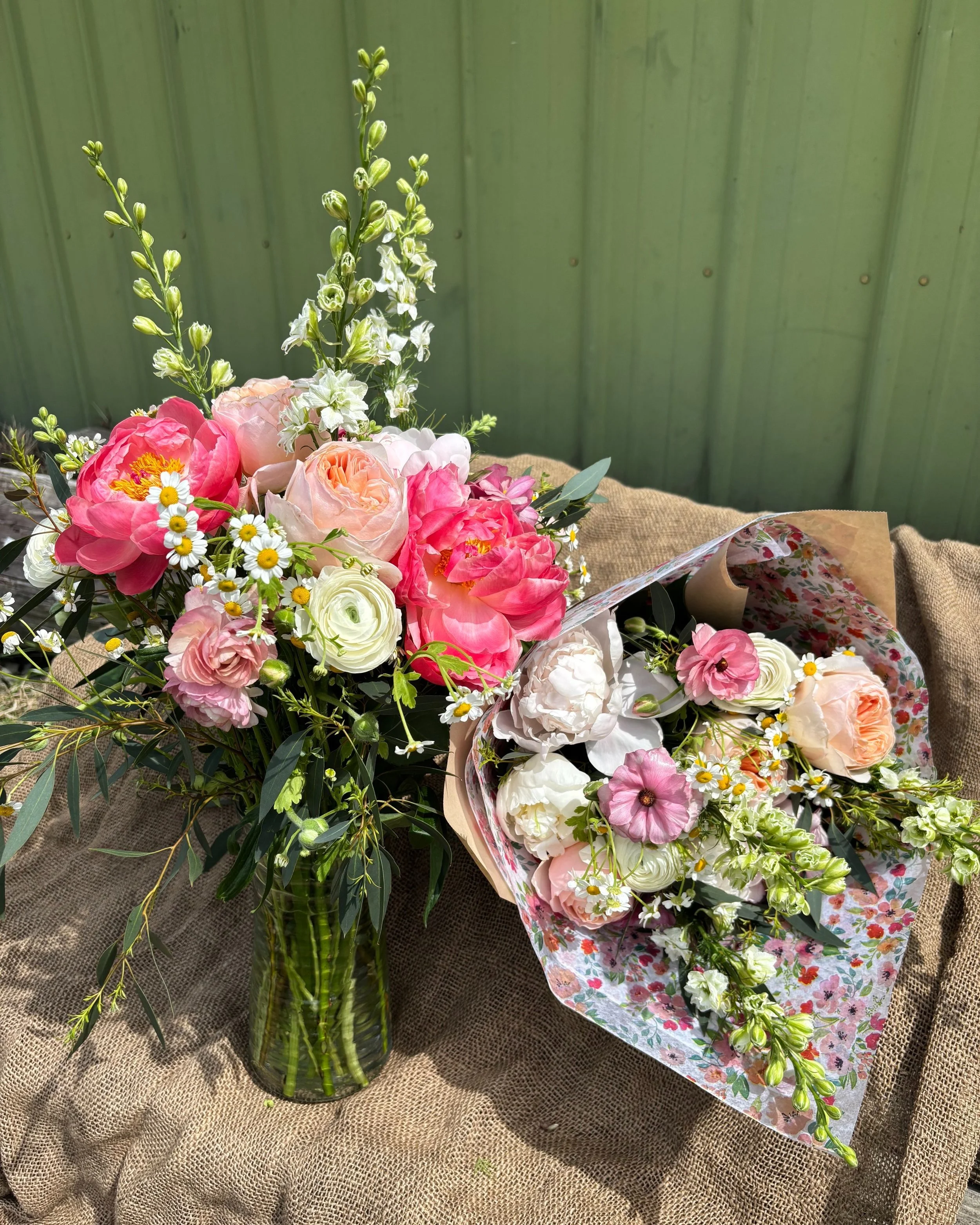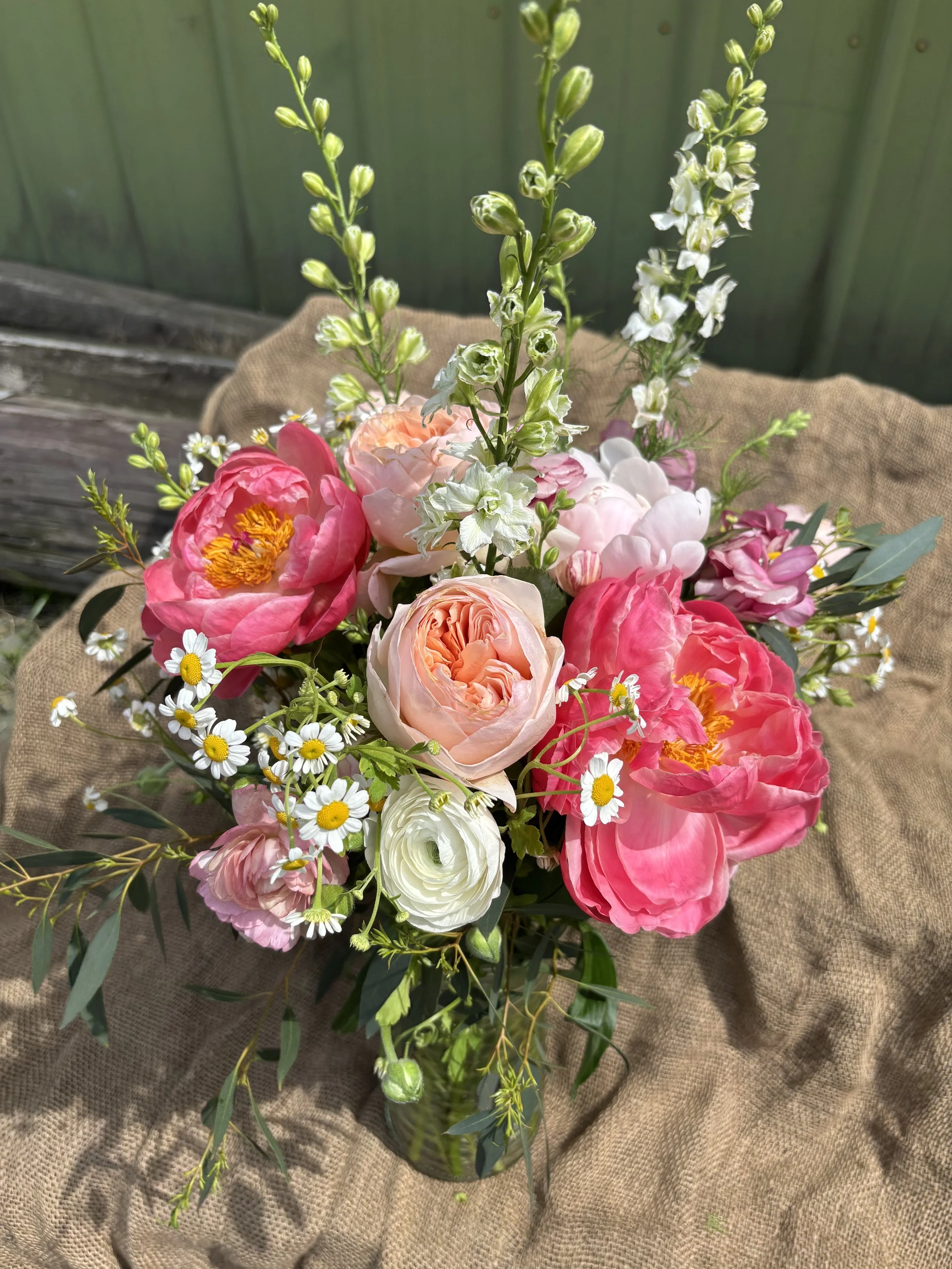 Each bouquet includes 3 peonies and 3 garden roses, paired with a seasonal mix of what’s most beautiful right now—ranunculus, tulips, and stock—along with airy touches of feverfew and eucalyptus for texture and movement.